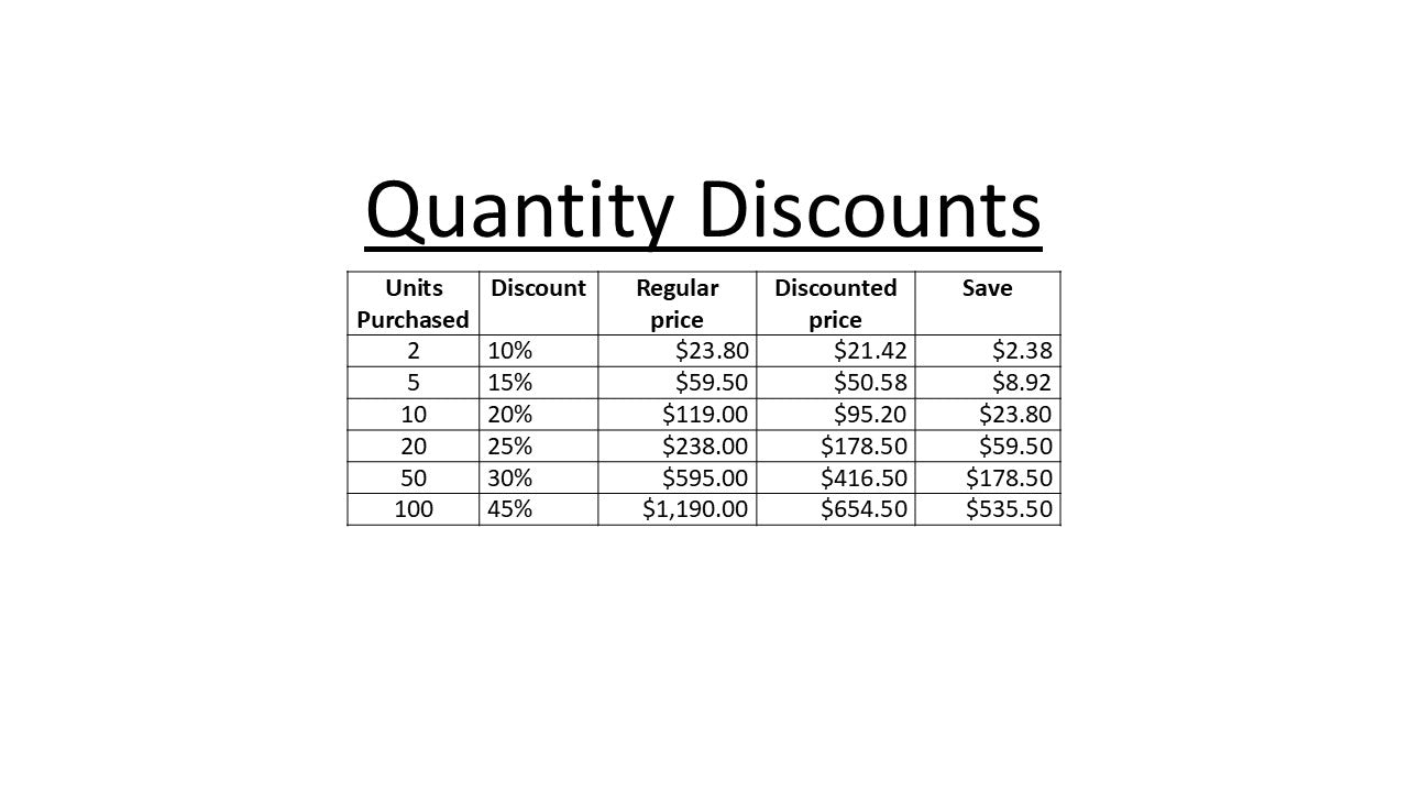 - Quantity discounts up to 45% off! The discounted amount will appear in your shopping cart.